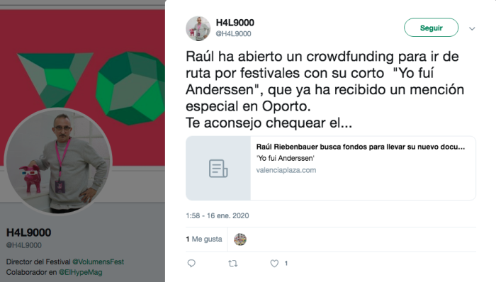 Conozco a H4L9000 desde aquellos tiempos en que yo tenía más pelo en la cabeza y ni asomo de canas en la barba. Nunca olvidaré aquella vez que, como DJ, H4L9000 pinchó en el Sónar. Yo preparaba un especial para un programa maravilloso del que era guionista, 'Colp d'Ull'. Ver ahí, a los platos, a H4L me alegró el día. Ahora Antonio José Albertos, H4L9000, dirige el @VolumensFest y también se suma a los apoyos a nuestro proyecto.