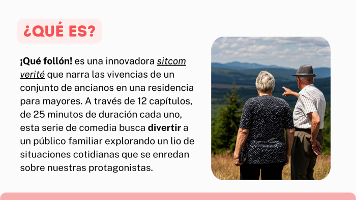 ¡Qué follón! es una innovadora sitcom verité que narra las vivencias de un conjunto de ancianos en una residencia para mayores. A través de 12 capítulos, de 25 minutos de duración cada uno, esta serie de comedia busca divertir a un público familiar explorando un lio de situaciones cotidianas que se enredan sobre nuestras protagonistas.